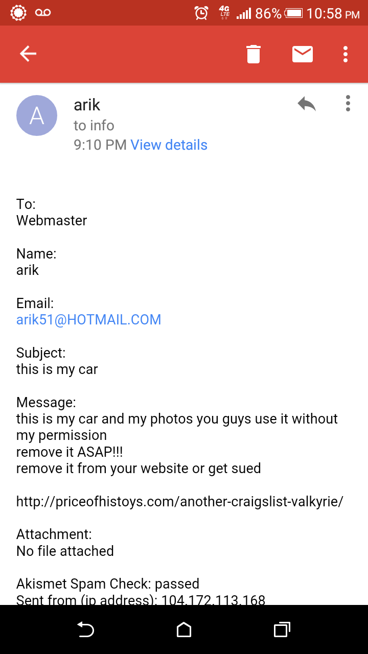 Per your threat I removed the photos that were on the Craigslist listing from 2012 and replaced them with a screenshot of the email you sent.