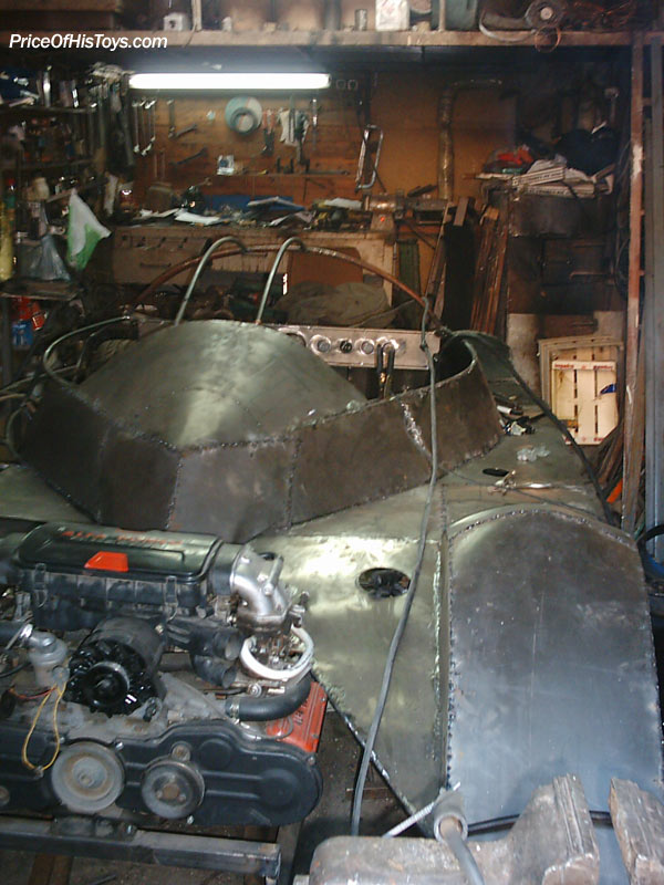 Now that’s ambitious! Joe Lee in Sofia (Bulgaria) is working on a largely from scratch metal-bodied Bentley EXP 2003 Speed 8 replica. The core chassis is a ’70 Bug with 15×12 and 15×8 wheels, all on an Alfa Romeo Engine. He figures it’ll be done next month — below are a couple pictures, and he’ll update us with the final product later.