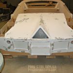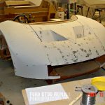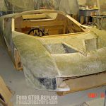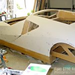 Because of the GT90’s simple angular design, it’s probably a good choice of a car to clone — and the fact that it’s a rare concept that few people have seen, unlike a car like a Countach were any kid can spot the smallest inaccuracy, will make it much more convincing. Des started with a set of wire-coverd wooden bulkheads over which he’s building up the final form with fiberglass and filler.